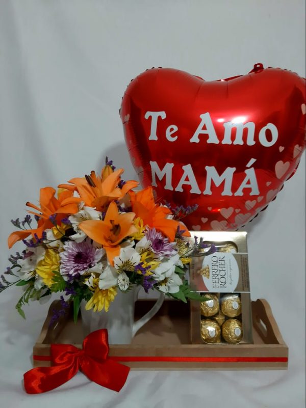 Bandeja decorada, arreglo primaveral, chóclate Ferrero 100g, globo temático y tarjeta de saludos.