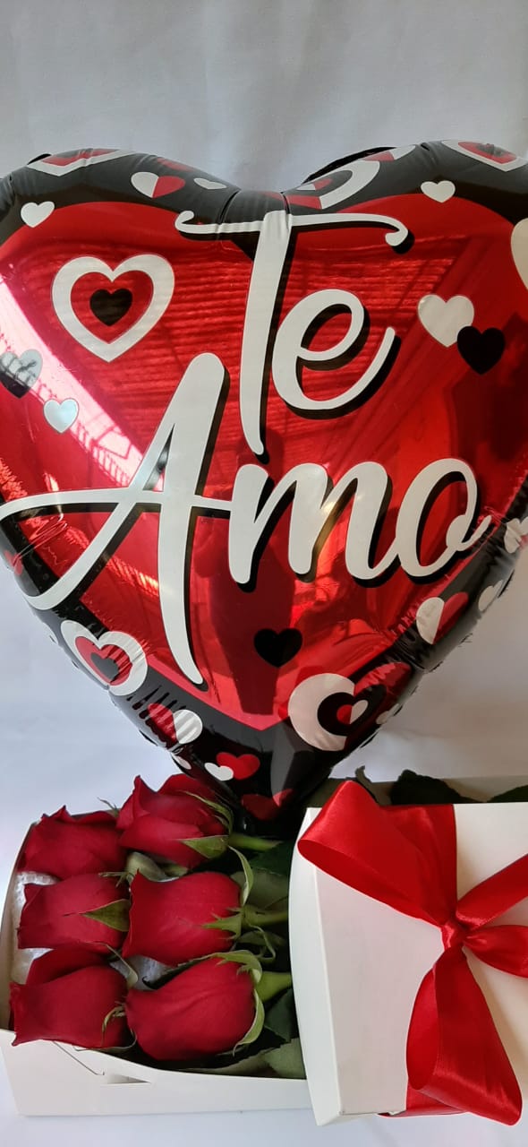 Caja blanca con 6 Rosas decorado con cinta de satín más Globo temático según el motivo y Tarjeta de saludos.
