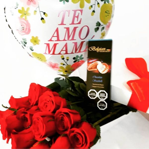 Linda caja de 12 Rosas Rojas importada de tallo largo más Chocolate Belgian 65g, Globo temático según el motivo y Tarjeta de saludos.