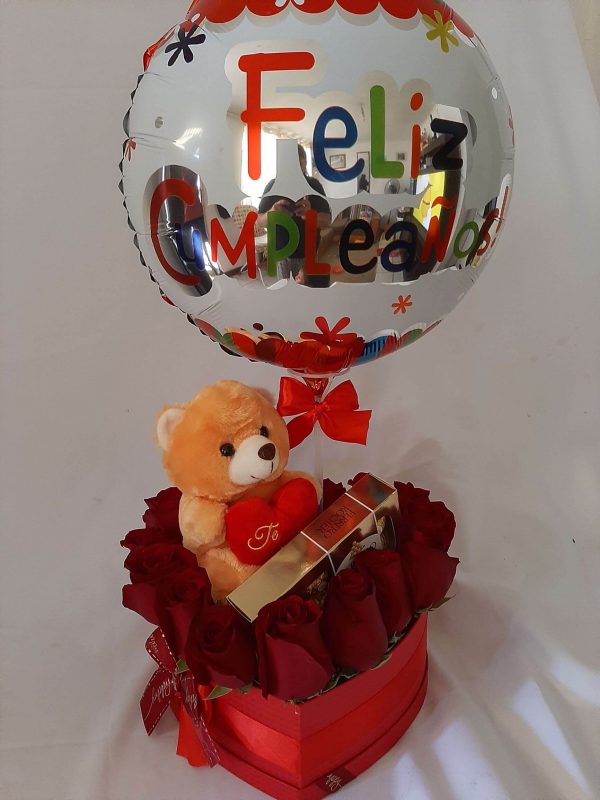 Tierna caja de corazón de 18 Rosas Rojas importadas, Peluche, Chocolates Ferrero 100g más Globo temático según el motivo y Tarjeta de saludos.