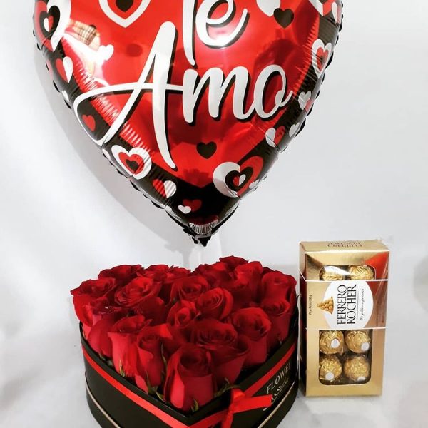 Hermosa caja de corazón de 12 Rosas Rojas, Chocolate Ferrero 100g más Globo temático según el motivo y Tarjeta de saludos.