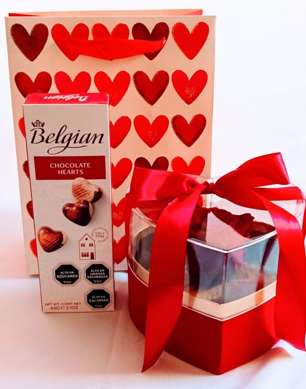 CAJA CON ROSA PRESERVADA CHOCOLATE BELGIAN TARJETA DE SALUDOS