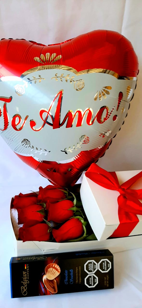 Hermosa caja blanca de 6 Rosas Rojas importadas más Chocolate Belgian 65g, Globo temático según el motivo más Tarjeta de saludos.