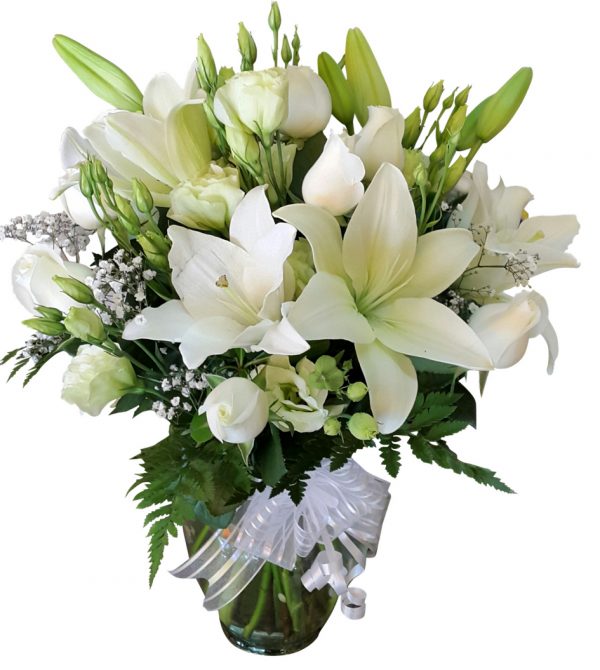 FLORERO LIDIA ROSAS, LILIUMS, LISIANTUS Y ASTROMELIAS BLANCAS FINO FOLLAGE TARJETA DE SALUDOS