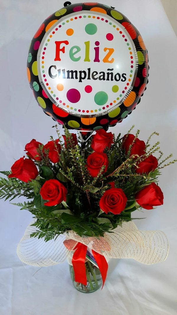 Lindo florero de Rosas Rojas acompañado con fino follaje más Globo temático según el motivo y Tarjeta de saludos, altura total 50 cm aproximado decorado con una cinta de satín.
