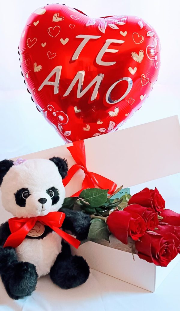 Caja de 6 rosas, osito panda de peluche, globo temático y tarjeta de saludos