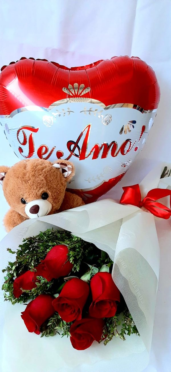 Ramo de 6 rosas rojas Osito de peluche Globo temático Tarjeta de saludos