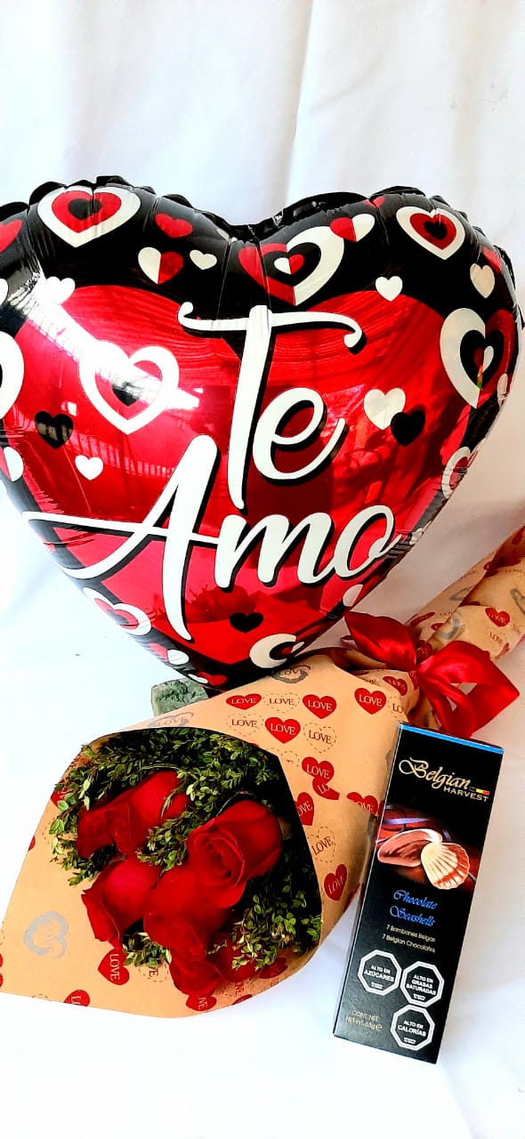 Hermoso ramo de 6 Rosas Rojas acompañado de follaje, envuelto con papel decorativo y cinta de satín más Globo temático según el motivo, Chocolate Belgian 65g y Tarjeta de saludo.