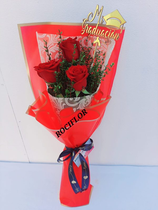 LINDO RAMO DE 3 ROSAS + LETRERO DE GRADUACION + TARJETA DE SALUDOS