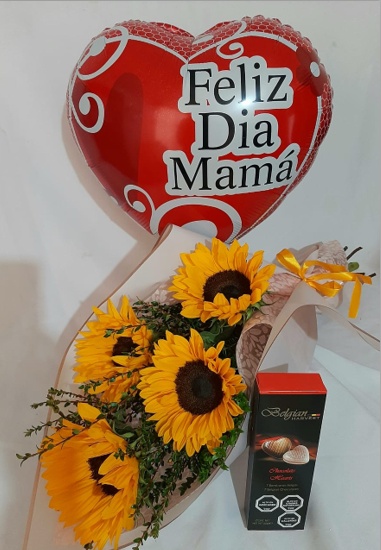 Ramo de girasoles, chocolate Belgian 65g, globo temático y tarjeta de saludos
