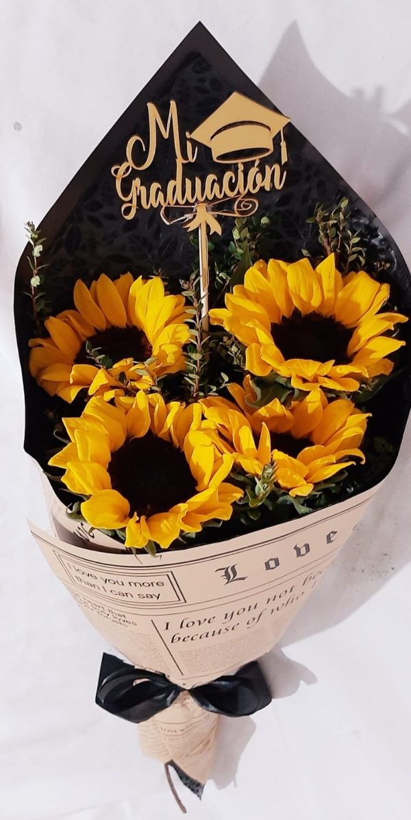 RAMO DE 4 GIRASOLES + LETRERO DE GRADUACION + TARJETA DE SALUDO